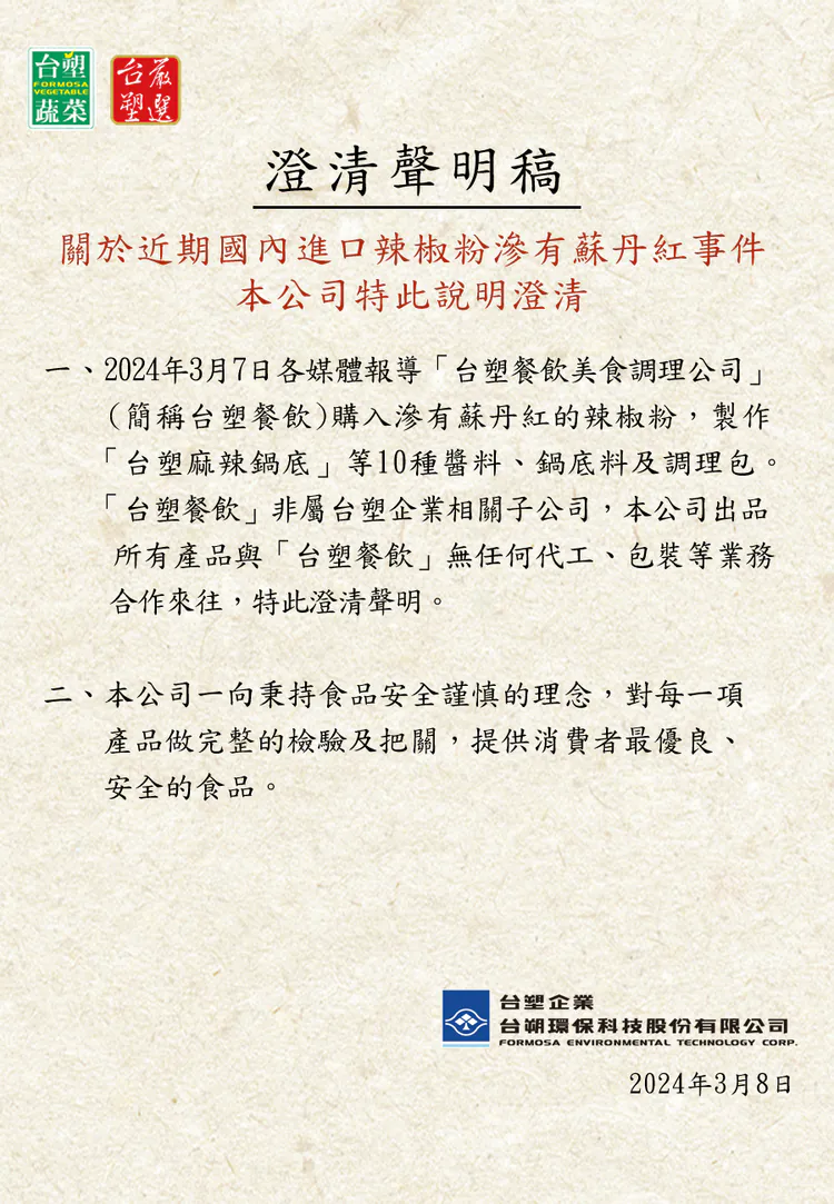 本公司只有「台塑蔬菜」、「台塑嚴選」兩個品牌名稱,其餘「台塑餐飲」、「台塑食品」皆與本公司無關